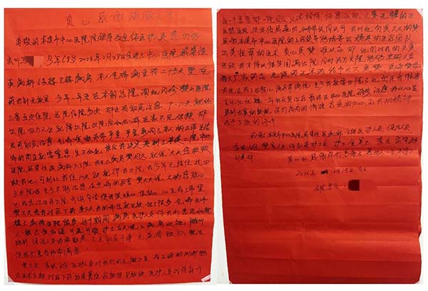 历经10天的精心救治与悉心照护,马女士的症状显著缓解,各类不适彻底消退,最终康复出院。为致谢这份跨越病痛的守护与温情,马女士亲笔写下满满两页感谢信,字里行间满是赤诚谢意;更送来镌刻“危难时刻显身手,救死扶伤见真情”的锦旗,以最质朴的方式,定格医护团队的精湛医术与医者仁心,也成为医患同心、共克病魔的暖心见证。