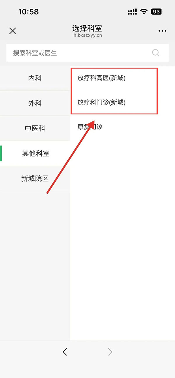 点开微信公众号,点击“预约挂号”按钮,选择太子河新城院区放疗科,进行预约挂号。